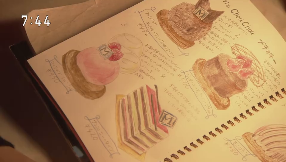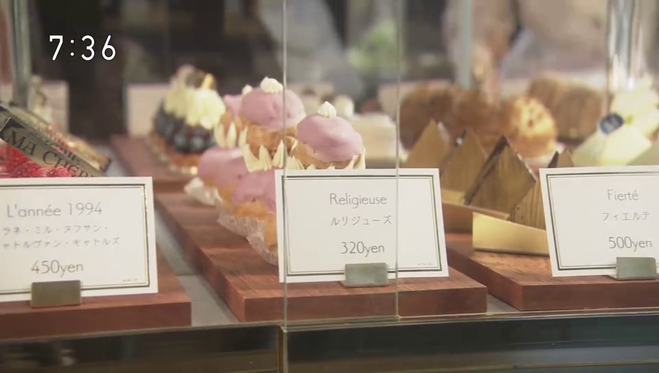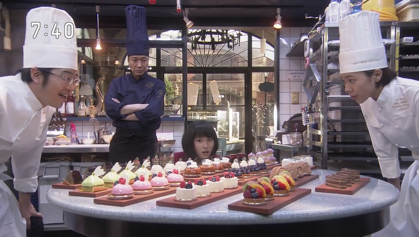 Qu’en est-il des différents thèmes du drama ? Pour ce qui est de la pâtisserie, comme je l’ai déjà dit l’apprentissage de Mare est trop typique du genre. Le pire, c’est qu’on nous ressort plus tard une autre newbie encore plus boulet qu’elle avec le prétexte : quand on fait des efforts, on finit toujours par y arriver. Ben non, parfois non. Si t’as pas de don pour la pâtisserie, fais autre chose quoi. Les noms français des gâteaux de la boutique d’Ikehata, qui porte le doux nom franponais de Ma chérie chou chou, sont super recherchés, et on va jusqu’à nous mettre quelques secondes de Gainsbourg pour celui qui s’appelle Je t’aime, moi non plus.