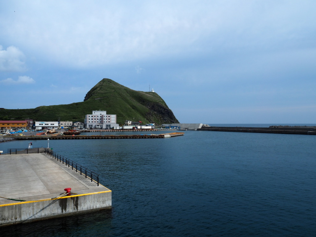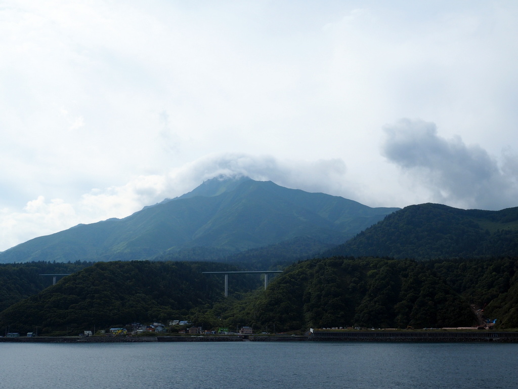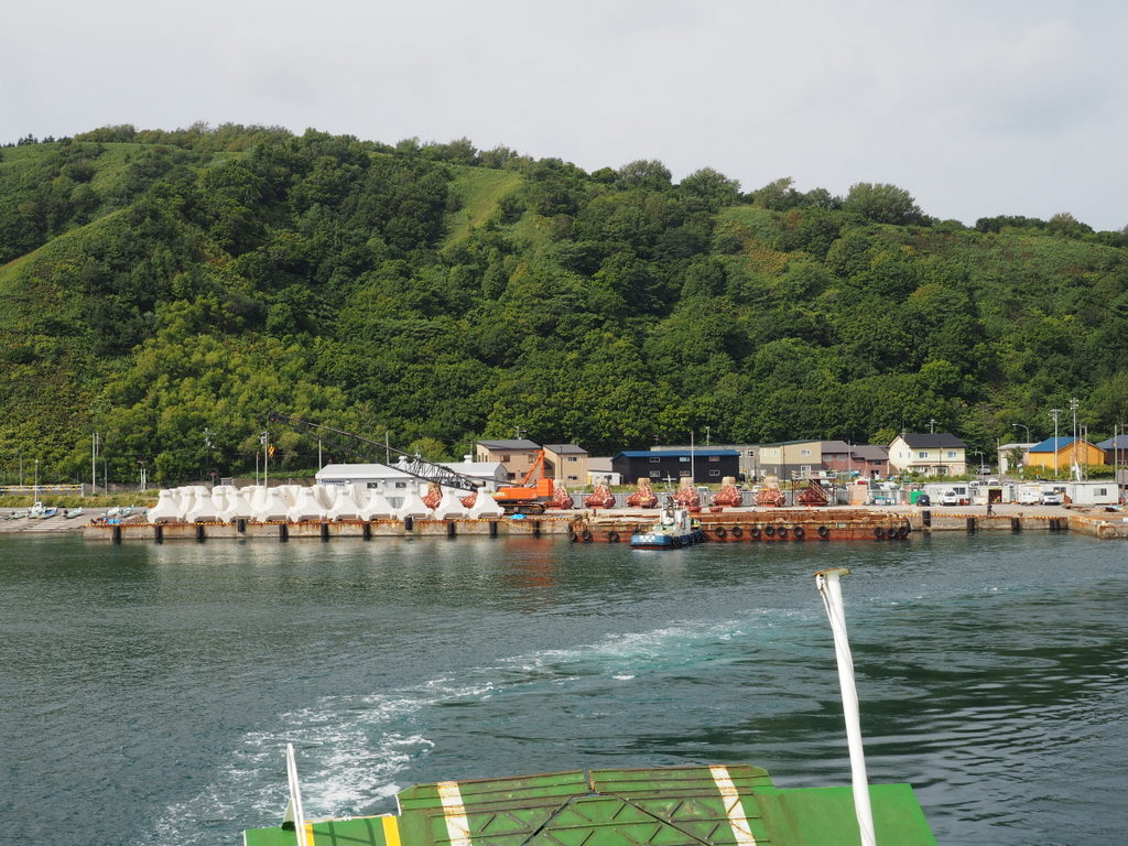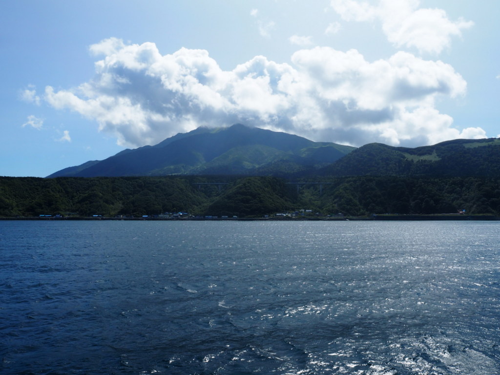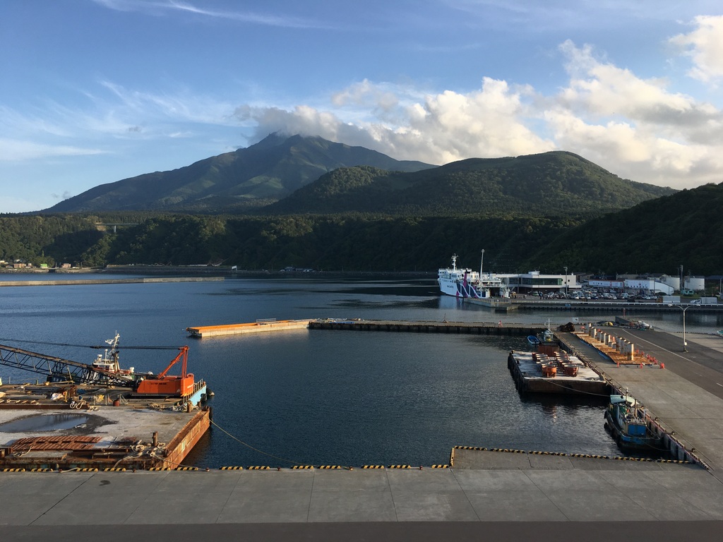 La traversée dure 1h30 et j’avais super hâte d’avoir à nouveau les pieds sur terre car je me sentais quand même assez mal. Ca faisait pas mal d’années que je n’avais pas pris de ferry, je me souviens que la traversée Calais-Douvres que j’avais faite quelques fois quand j’étais à Londres c’était pas génial si la mer était un peu agitée et effectivement ça ne s’est pas arrangé avec le temps, pas étonnant vu ce que c’est avec le bus ou la voiture ! Au fur et à mesure qu’on s’approchait, le Rishirifuji, mont qui domine l’île, se faisait plus grand et plus net. Il y avait quelques nuages autour de lui mais le temps était bien dégagé. Quand nous avons débarqué il était déjà l’heure du déjeuner. Nous avons mangé un ramen avec un bouillon à base d’algues dans un petit resto juste en face du terminal.