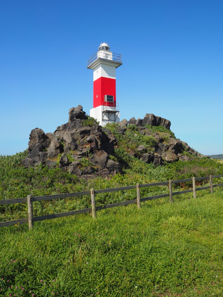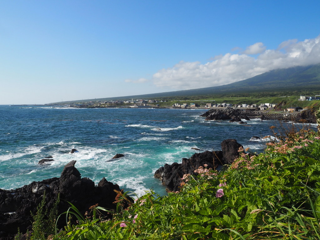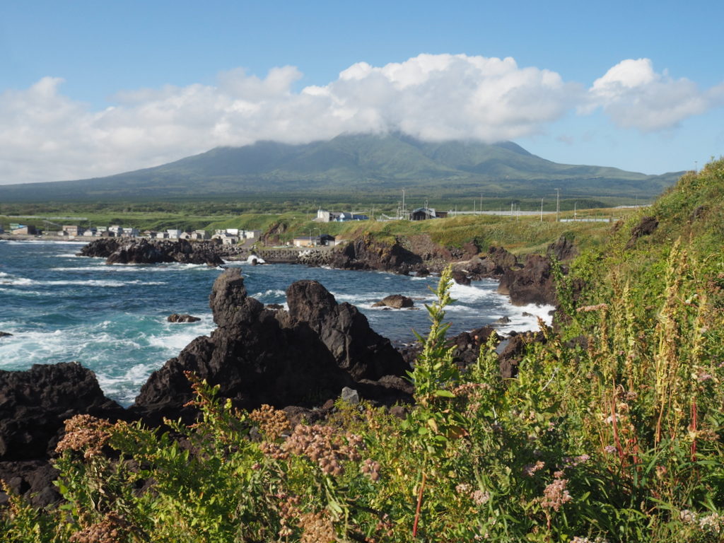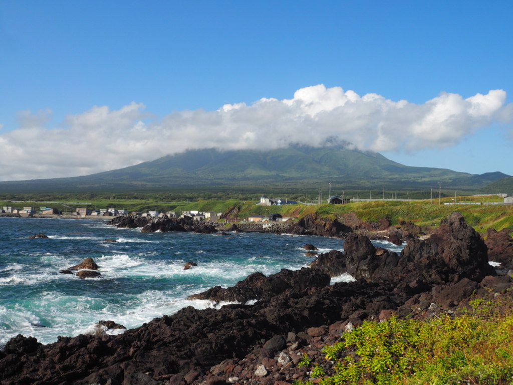 On s’est d’abord arrêtés près d’un petit phare rouge et blanc. Je pense qu’on voit le Rishirifuji d’à peu près tous les coins de l’île, et c’était bien le cas là. Le contraste de la roche noire volcanique avec le bleu de l’eau et l’écume blanche des vagues est vraiment chouette. Techniquement, ici ce n’est plus la mer d’Okhotsk mais « juste » la mer du Japon, mais bon la couleur reste la même :).