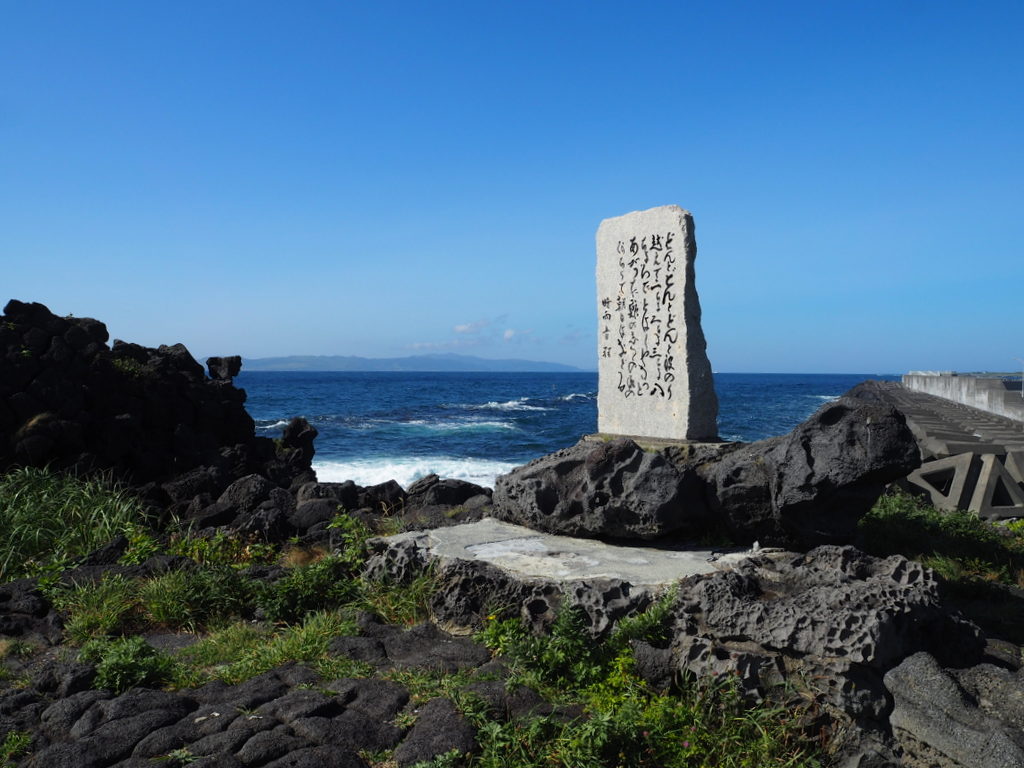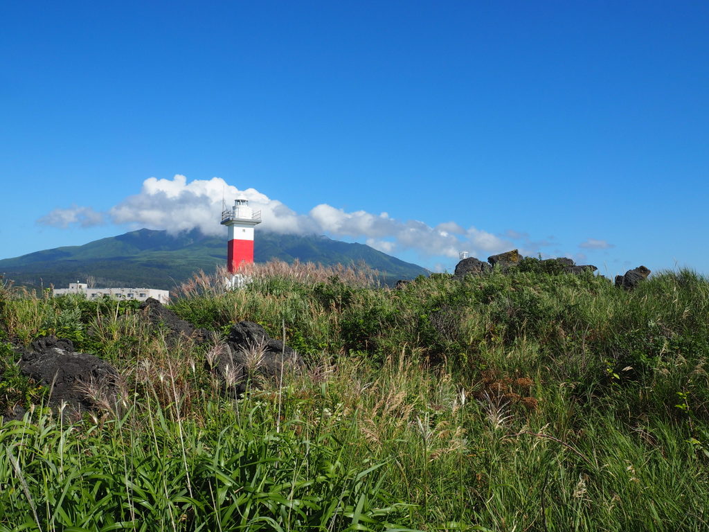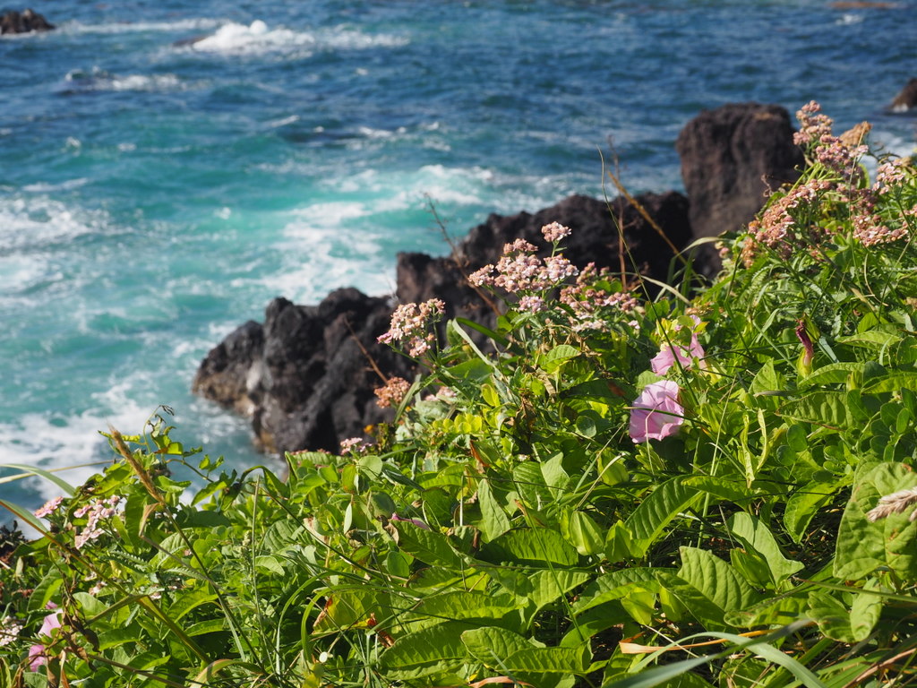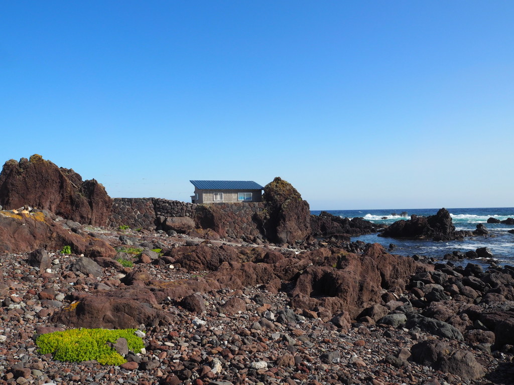 On s’est d’abord arrêtés près d’un petit phare rouge et blanc. Je pense qu’on voit le Rishirifuji d’à peu près tous les coins de l’île, et c’était bien le cas là. Le contraste de la roche noire volcanique avec le bleu de l’eau et l’écume blanche des vagues est vraiment chouette. Techniquement, ici ce n’est plus la mer d’Okhotsk mais « juste » la mer du Japon, mais bon la couleur reste la même :).