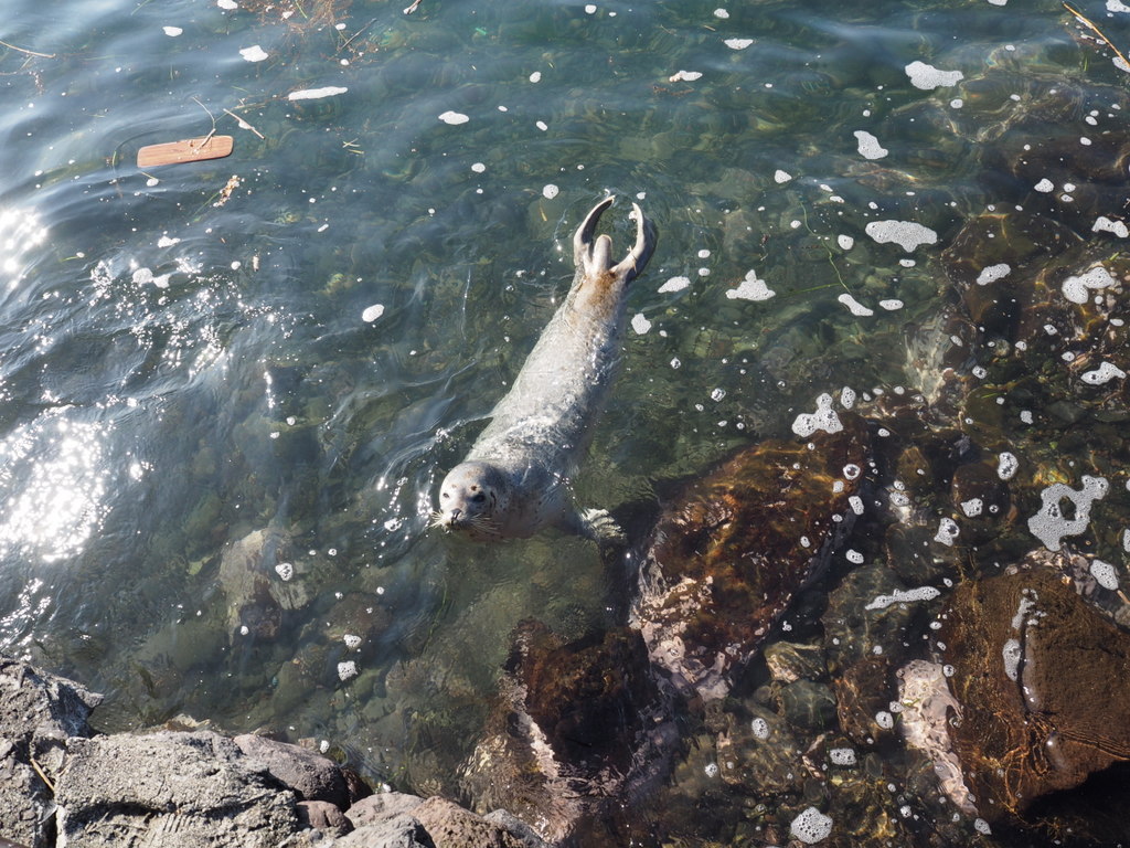 La carte de l’île que nous avions prise à l’office du tourisme indiquait un endroit où l’on pouvait voir des phoques. Ce point a donc été notre arrêt suivant alors que nous continuions à descendre la côte ouest de Rishiri. Grosse déception : ce qu’il y a à voir c’est juste un malheureux phoque prisonnier dans un enclos à flanc de rochers ! Franchement, j’aurais préférer qu’il s’agisse d’animaux en liberté, quitte à ne pas pouvoir en voir à tous les coups.