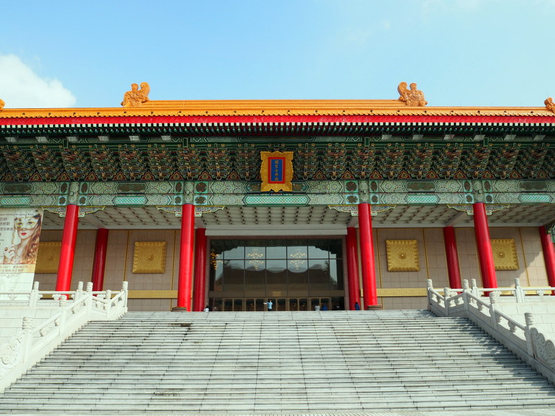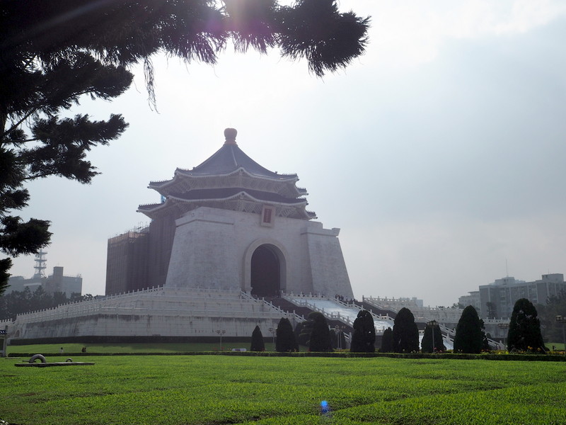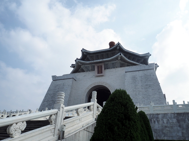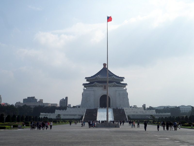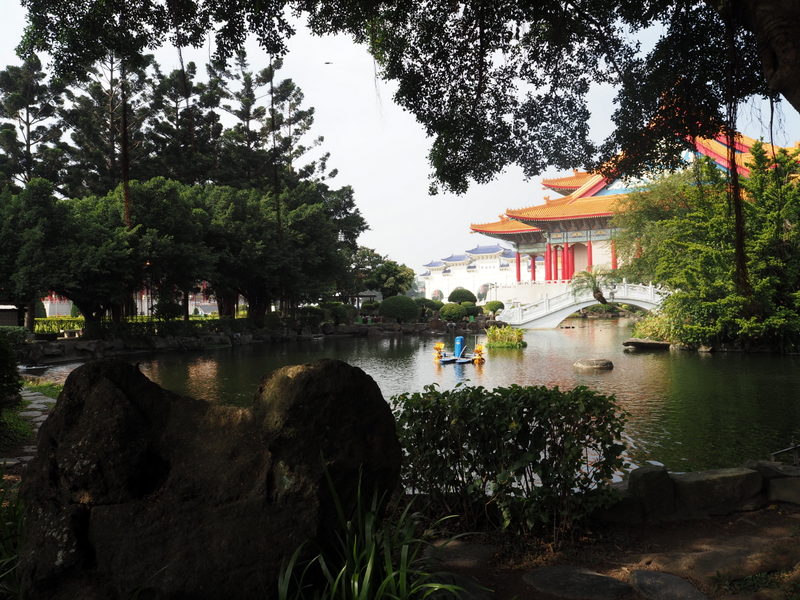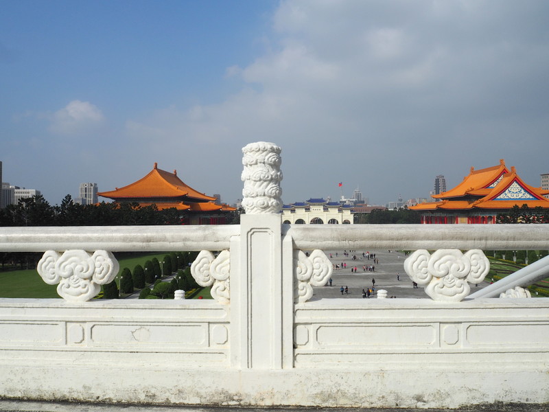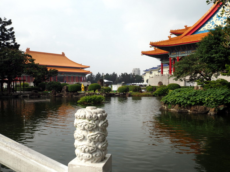 Notre première visite a été celle du mémorial Chang Kai Chek et du parc qui l’entoure. Le ciel un peu couvert et le soleil assez haut ont commencé à me jouer des tours, surtout avec un bâtiment d’un blanc éclatant ! Ce n’était pas un bon jour pour prendre des photos quand on ne s’y connait pas assez comme moi, mais ça n’a rien enlevé à la beauté des lieux. Le parc, avec les galeries qui longent les murs qui l’entourent, son plan d’eau, sa verdure et ses fleurs même en plein décembre, ses écureuils, est un endroit dont j’ai adoré l’ambiance et le calme. Le mémorial est une construction vraiment imposante, de l’extérieur comme de l’intérieur. Les rampes et balustrades sculptées qui l’entourent sont très belles. Du haut des marches, on a une vue superbe sur la place de la Liberté avec les deux imposants bâtiments que sont le théâtre et la salle de concert nationaux aussi que la porte principale (photo en tête de cet article).