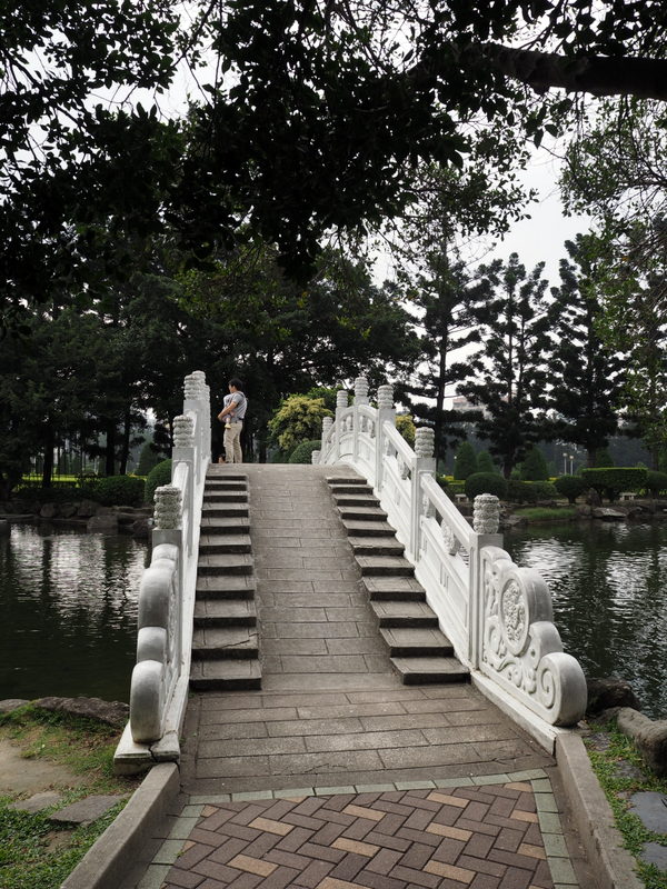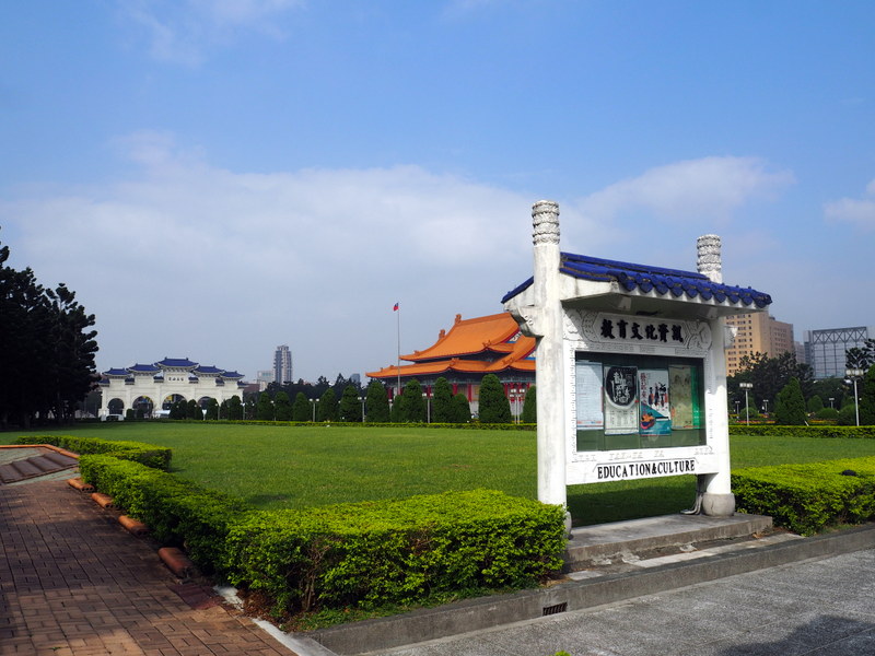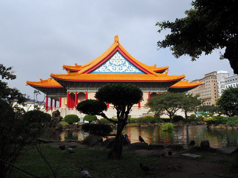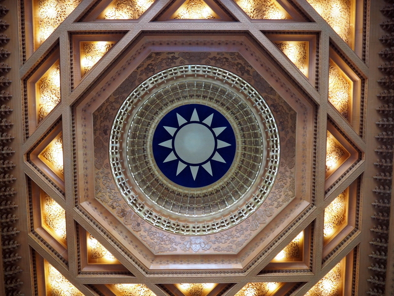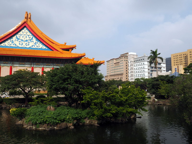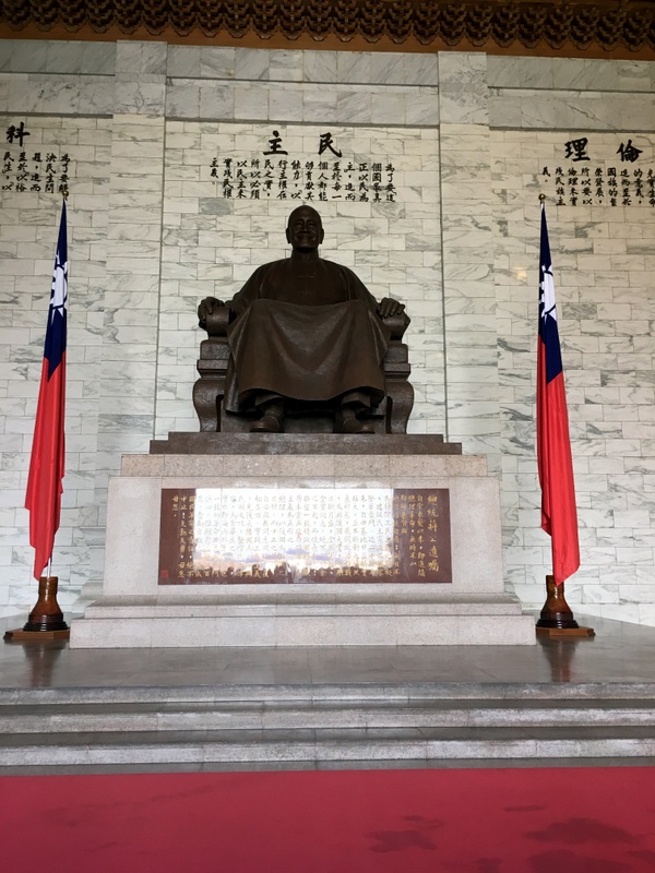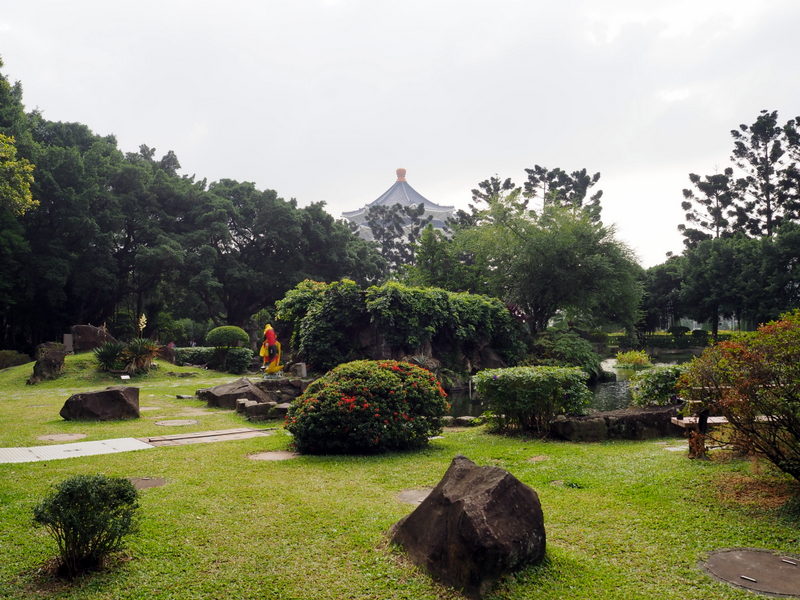 Notre première visite a été celle du mémorial Chang Kai Chek et du parc qui l’entoure. Le ciel un peu couvert et le soleil assez haut ont commencé à me jouer des tours, surtout avec un bâtiment d’un blanc éclatant ! Ce n’était pas un bon jour pour prendre des photos quand on ne s’y connait pas assez comme moi, mais ça n’a rien enlevé à la beauté des lieux. Le parc, avec les galeries qui longent les murs qui l’entourent, son plan d’eau, sa verdure et ses fleurs même en plein décembre, ses écureuils, est un endroit dont j’ai adoré l’ambiance et le calme. Le mémorial est une construction vraiment imposante, de l’extérieur comme de l’intérieur. Les rampes et balustrades sculptées qui l’entourent sont très belles. Du haut des marches, on a une vue superbe sur la place de la Liberté avec les deux imposants bâtiments que sont le théâtre et la salle de concert nationaux aussi que la porte principale (photo en tête de cet article).