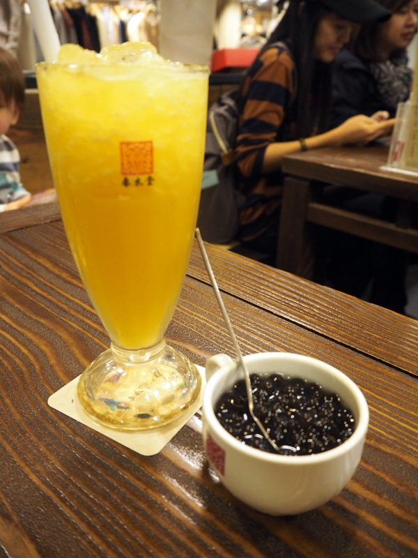 Nous avions déjà pas mal marché, il était temps d’accorder une pause à nos pieds et de faire appel un peu aux transports en commun. De la station juste en face du temple, nous avons pris le métro pour aller du côté de Zhongshan, que mon guide annonçait être comme le Harajuku de Taipei. Alors, on n’a pas été plus loin que dans la grande rue, mais au premier abord ça m’a plus fait penser à Ginza. J’avais repéré une adresse de bubble tea, et la boutique s’est avérée être dans un Mitsukoshi (une des chaînes japonaises de grands magasins avec plein de trucs chers :p). Il s »agissait de la chaîne Chun Shui Tang, qui a maintenant plusieurs adresses au Japon. Si je me souviens bien j’ai pris une boisson au kumquat, et comme le tapioca n’était pas compris de base il était servi à part. L’homme a pris un thé au lait tapioca classique, comme ça j’ai pu goûter aussi.