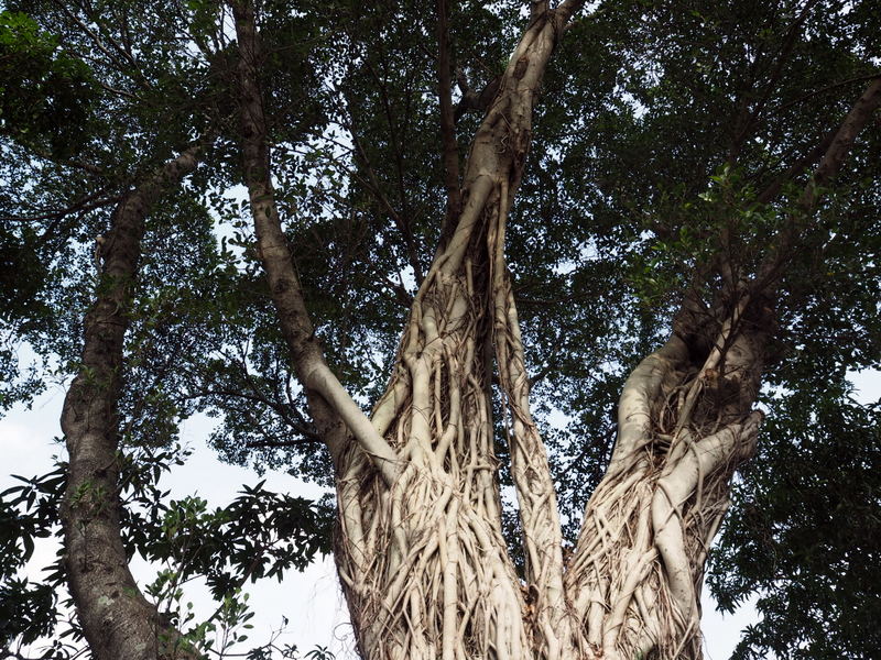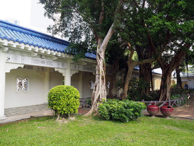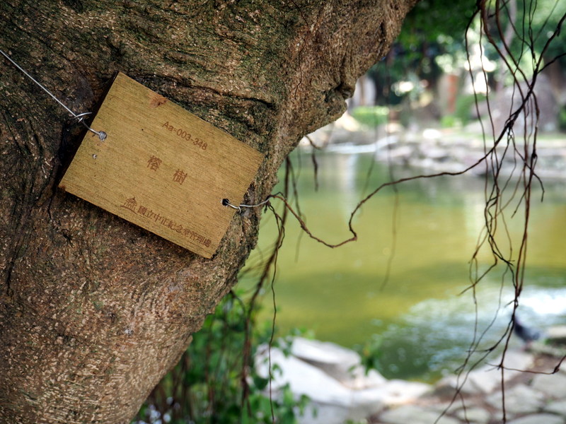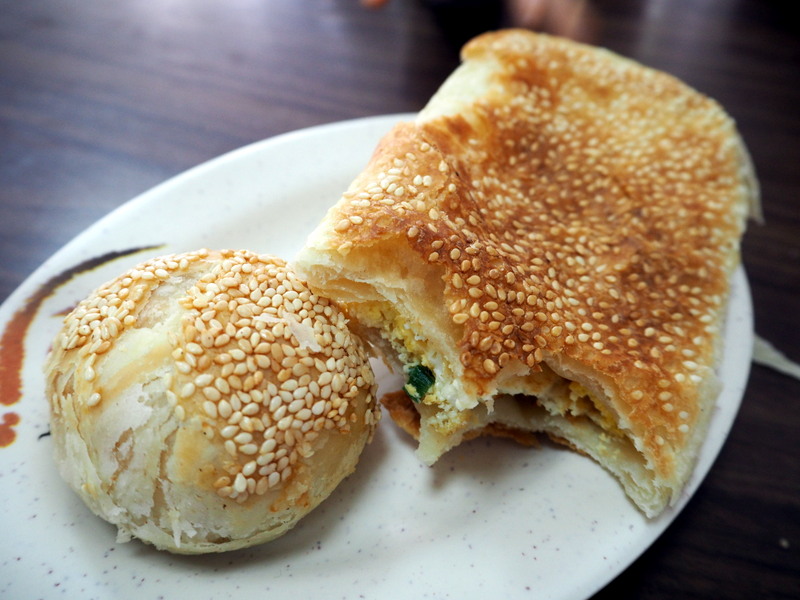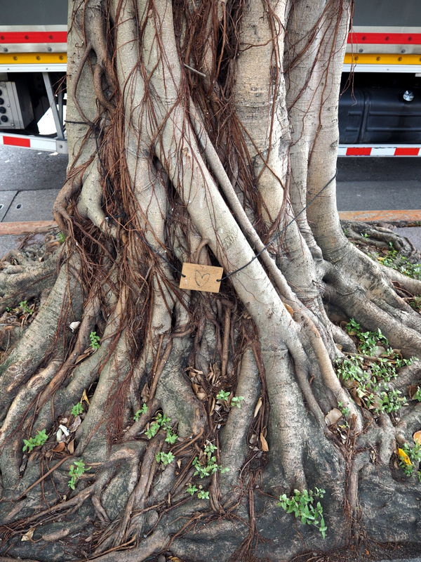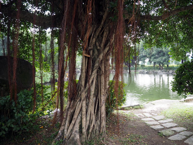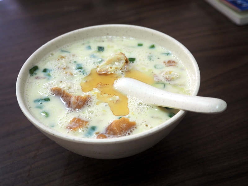 Dans le parc, comme dans de nombreux endroits de Taipei, on trouve de nombreux arbres au tronc très particuliers et avec des sortes de lianes  qui tombaient. Il s’agit de ficus microcarpa. Après ça, midi approchait alors nous avons décidé de faire notre pause déjeuner dans les environs avant de nous rendre sur notre lieu de visite suivant. Mon petit guide japonais de Taipei co-Trip mentionnait une adresse qui nous a paru intéressante, un petit resto spécialisé dans les « soupes » de lait de soja. J’adore tous les produits à base de soja donc ça me faisait bien envie ! On s’est rendu compte après qu’en fait c’était plutôt de la nourriture servie au petit déjeuner mais vu que c’était encore servi à cette heure ça aurait été dommage de s’en priver ! On a commandé un peu au hasard des sinogrammes qu’on reconnaissait, chacun un bol de soupe et des pains frits garnis de graines de sésame, le long était avec de l’oeuf et des légumes.