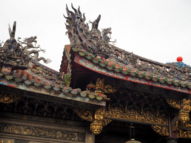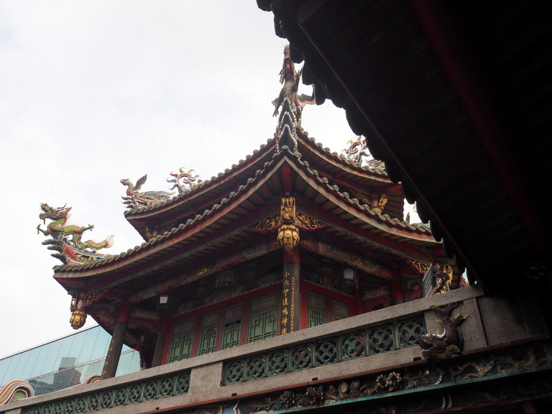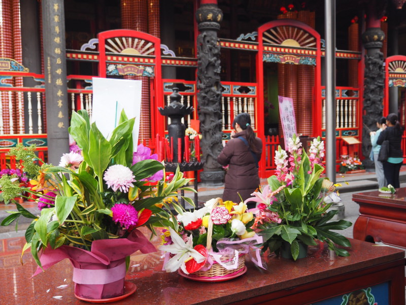 De là, nous n’avons pas eu bien loin à aller pour arriver jusqu’à l’un des lieux de culte les plus célèbres de Taipei, le temple Lungshan. Pour moi qui adore les temples bouddhistes au Japon, c’était un vrai bonheur de pouvoir en découvrir un dans un autre pays, où là aussi il s’est apparemment mêlé aisément aux croyances locales. Evidemment, l’architecture est très différente, plus décorée et colorée (après, ça dépend aussi quel courant bouddhiste japonais on considère ^^). Dans l’enceinte du temple, il y avait beaucoup de fleurs et d’offrandes de nourriture. J’ai beaucoup aimé l’ambiance, mais je n’ai pas pris beaucoup de photos car j’ai toujours peur de déranger ceux qui sont venus pour prier. Parce que comme pour les sanctuaires shintô, même si l’ambiance paraît plus cool que dans une église catholique, ça reste un lieu de culte quand même. Et puis quand je levais mon objectif vers les décorations des toits, il y avait toujours ce ciel un peu couvert avec cette lumière qui faisait un contre-jour à peu près dans toutes les directions -__-.