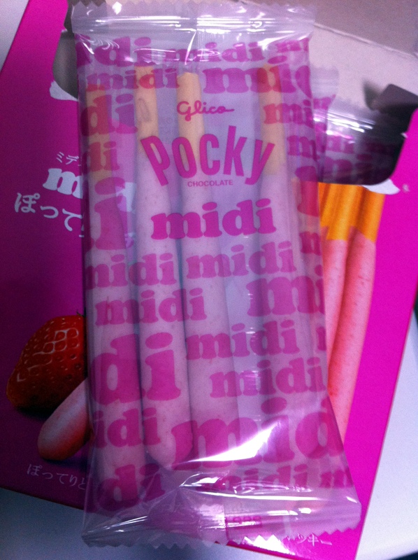 Si on ne change pas vraiment le type de saveur, comment donner l’impression de faire du nouveau avec une friandise en bâtonnet ? En le faisant plus court et plus épais ! Et nous voilà avec les Pocky un peu trop enrobés et courts, les Pocky midi ! Effectivement, l’épaisseur de l’enrobage change la sensation en bouche. J’avais pris fraise histoire de ne pas prendre le classique chocolat au lait mais en fait c’était pas une bonne idée :p.